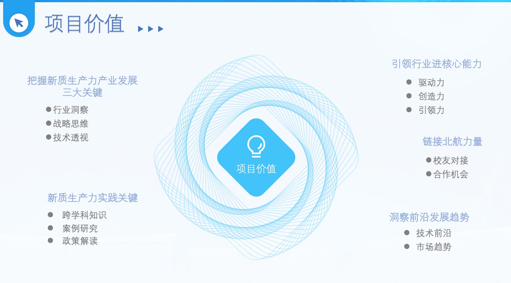 “新质生产力领军企业家”高端项目是北航依托优势学科和新质生产力的高度契合,把握时代所需,强化产教融合,为新质生产力发展持续提供人才科技支撑而设立。项目专注于低空经济、人工智能、数字经济,生物医药,高端装备制造等新兴领域,结合前沿的商业模式和技术创新,为学员提供全面深入的学习体验、丰富的知识和技能,助力学员在新兴领域取得成功。
